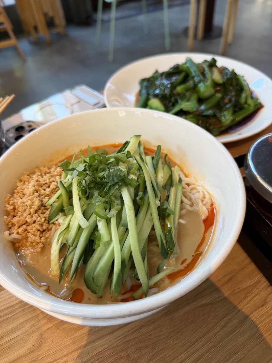 Yum! Came here initially wanting some of their breakfast menu but they don't have it all day. However, their lunch menu didn't disappoint. It is clearly marked which items are vegetarian. It was empty enough that we just ordered at the counter, got a number and sat ourselves. The aesthetic of the place is really nice with muted mint tones and there is a self-serve water station (with still or sparkling water) and to-go containers to get yourself. Staff was really quick to take plates away as well and friendly. We got the seaweed salad, ma po tofu with mushroom, hot and sour soup, fried rice cake with basil and tang yuan. They were all super delicious. Surprisingly, we ended up ordering items mostly that were semi-spicy. The noodles were not and they were good as well. I think I prefer the dan dan noodles though because of the bit of cucumber in it for freshness. Parking can be a bit tough due to street parking but on a Sunday, parking was free and we found a spot! They are also next to a park of sorts so you could also take to-go and sit in the park. I saw some people doing that.